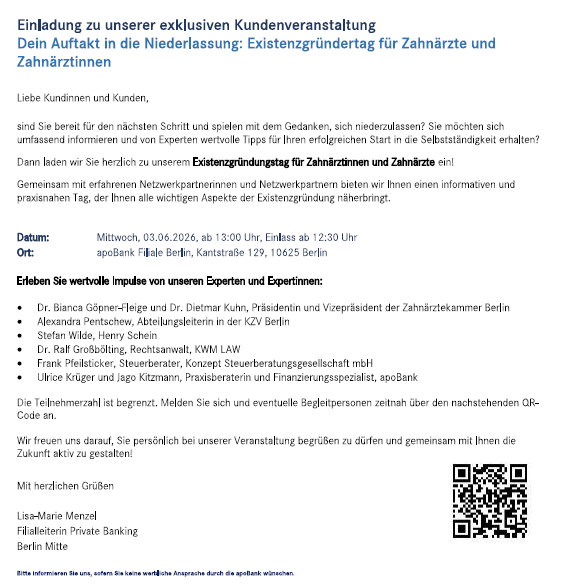 „Bei meiner Niederlassung und Praxisneugründung wurde ich in allen rechtlichen Fragestellungen – vom Neubau der Praxisräume über das Zulassungsverfahren bis hin zur Prüfung meiner Website – umfassend durch KWM LAW begleitet. Die beteiligten Anwälte haben sich stets kompetent und zielorientiert um alles Erforderliche gekümmert.“
